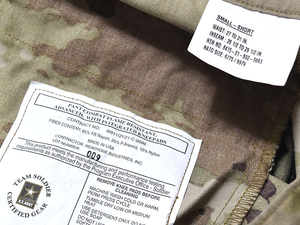 米軍実物、新型のADVANCEDコンバットパンツ(PANTS COMBAT FLAME RESISTANT ADVANCED WITH INTEGRATED KNEEPADS)です。ウエスト、膝の位置はベルクロで調節可能。前モデルと比べ、ニーパッド、挿入スペースのデザインが変わりました。専用のニーパッドが挿入できます。Crye製のもの挿入自体は可能ですが、中に収納できるフィールド用がおすすめです。