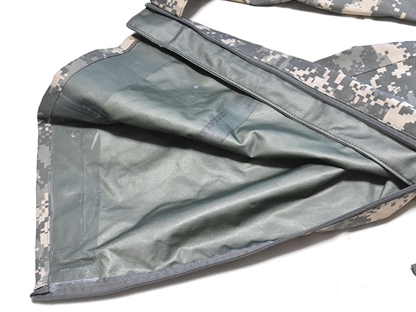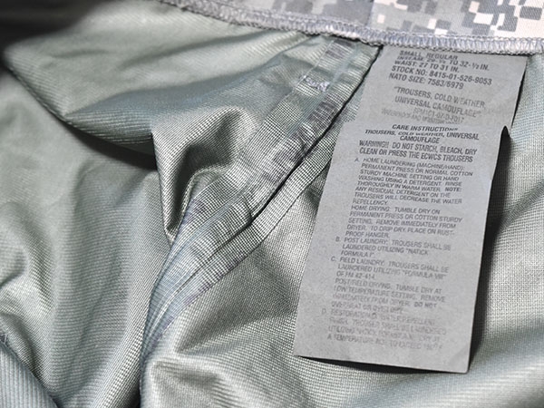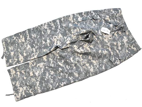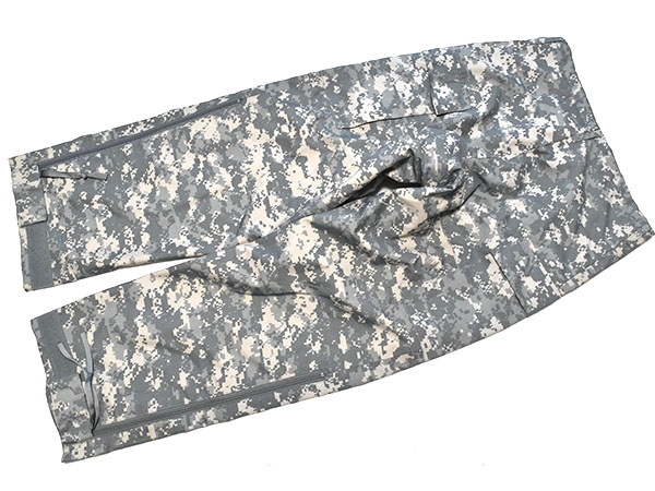 米軍実物、ECWCS (Extreme Cold Weather Clothing System) GEN2のACUカラーのゴアテックスパンツです。防水性の高いGore-Texを使用しており、ウエストはゴムで調節可能、両サイドポケットはインナーにアクセスするために貫通式となります。