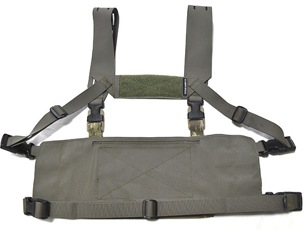 米軍放出品、EX UMBRIS製、レンジャーグリーンカラーのMACVチェストリグです。パネル中央にベルクロ式のポケットが付属。プラカードは別メーカの物かと思います。