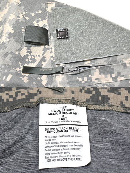 米軍実物、陸軍で使用されているEWOLジャケットのテストサンプルです。難燃性素材を使用した防水仕様のジャケットとなります。脇下にベンチレーション、背中は開閉します。※ゴアテックスの表記はありません。