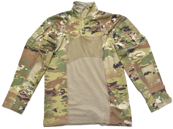 米軍実物、陸軍で使用されている新型のOCPカラー(スコーピオン)のMASSIF ACS Type IIコンバットシャツです。前モデルと似ていますがセンターにジッパーが付いており、よりスムーズに着脱が可能となっています。両肩にベルクロの付いたポケットが2つ、袖に小さなポケットが1つ付いています。伸縮性・難燃性が高く、プレートキャリアやボディアーマーを着用した際に蒸れを軽減できるよう通気性・乾燥性に優れた生地を使用しています。肩にIRが付いています。