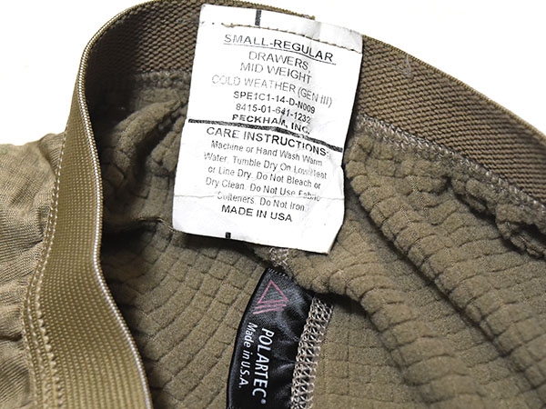 米軍実物、陸軍で使用されている最新コヨーテカラーのLEVEL2コールドウェザーグリッドフリースパンツです。裏地はワッフルと呼ばれる非常に肌触りが良く、防寒性の高い生地を使用しています。