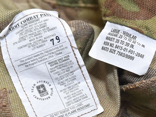 米軍実物、陸軍放出のARMYコンバットパンツです。こちらは2012年頃から陸軍特殊部隊にて使用が確認されているCRYEタイプの新型コンバットパンツです。現在では一般の戦闘部隊でも使用が見られます。パッドは付属していませんが、CRYE製と同形状のパッドが使用できます。フロントはボタンとなっており、8つのポケットが付いています。希少なアイテムです!