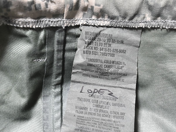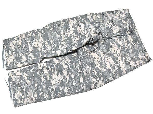 米軍実物、ECWCS (Extreme Cold Weather Clothing System) GEN2のACUカラーのゴアテックスパンツです。防水性の高いGore-Texを使用しており、ウエストはゴムで調節可能、両サイドポケットはインナーにアクセスするために貫通式となります。